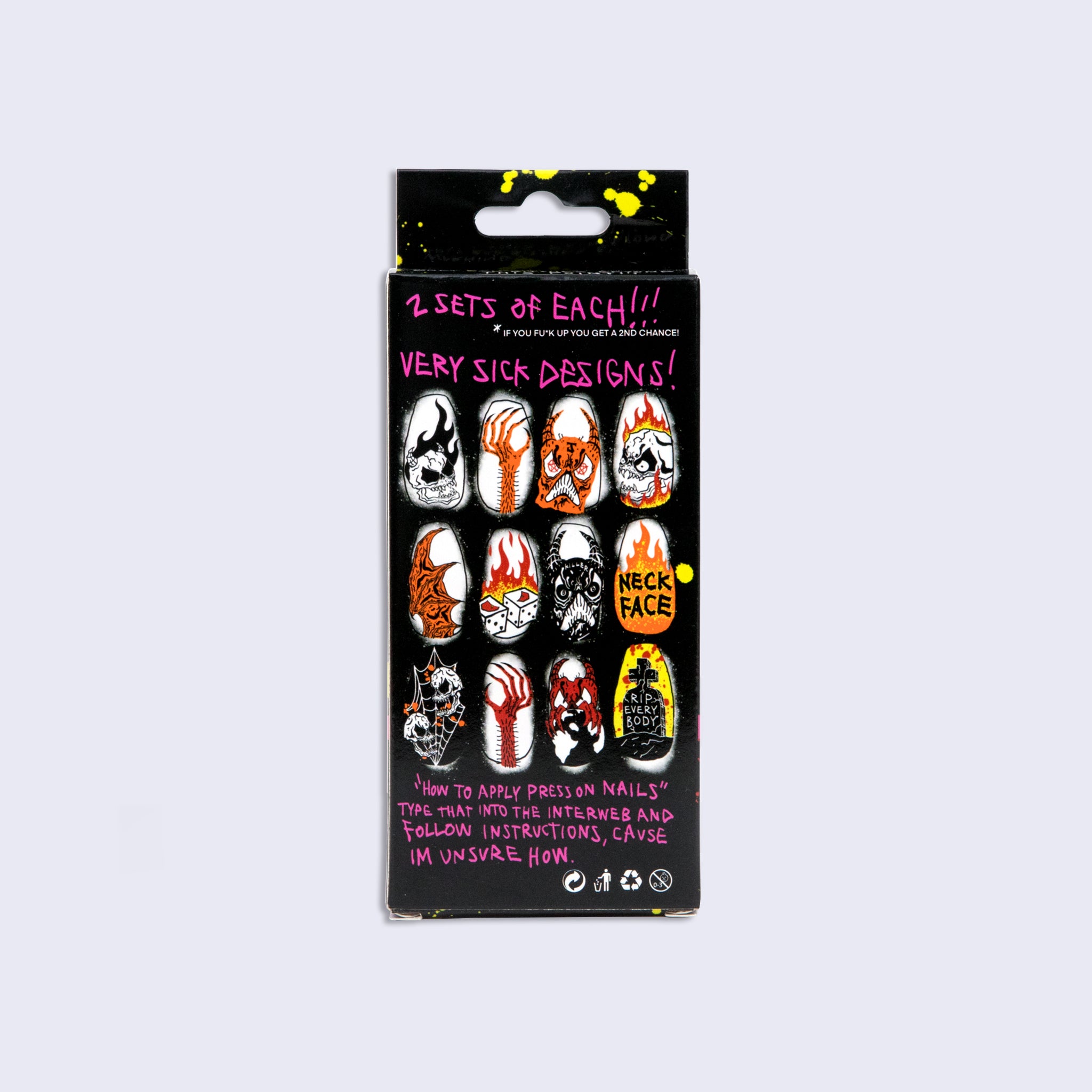 BE THE LIFE OF THE GRAVEYARD WITH THESE SICK NECKFACE PRESS ON NAILS!!! 2 SETS OF 12 DIFFERENT GHOULISH DESIGNS. THATS 24 NAILS TOTAL!!! EVEN IF YOU SCREW UP YOU’LL HAVE SOME LEFT TO SPARE!!!